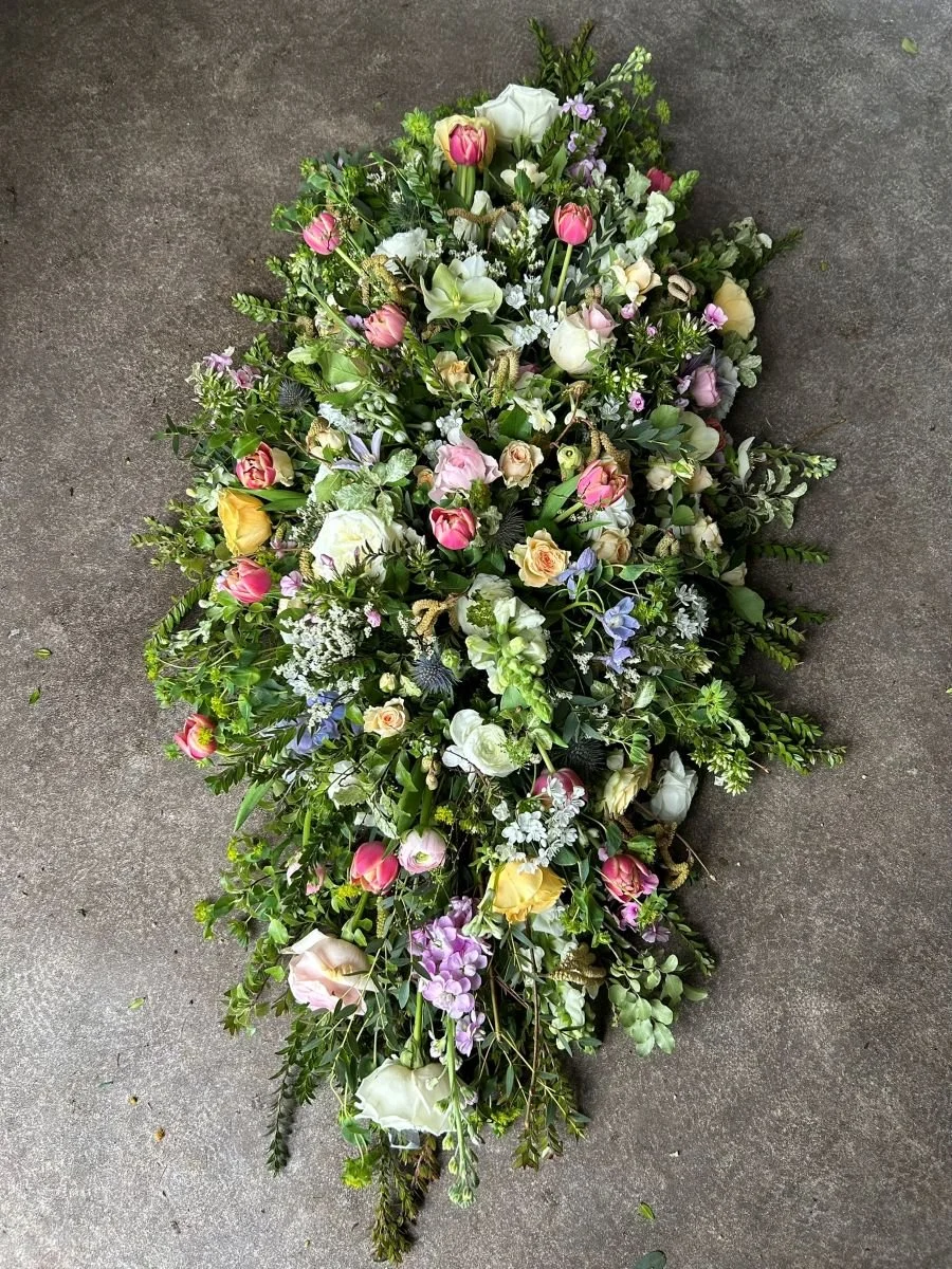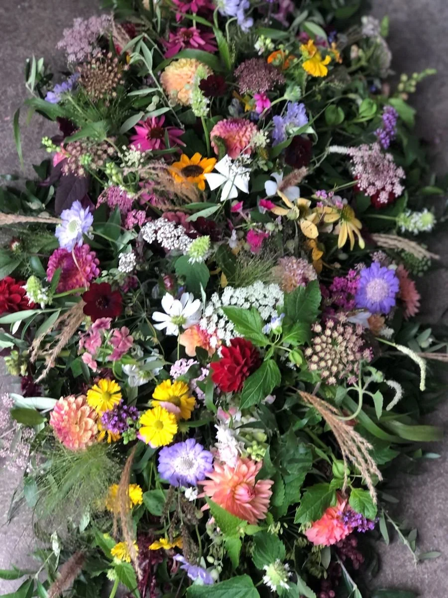 My floristry style is natural, loose, a little bit wild and relaxed in look and feel, nothing too structured or formal. Any personal touches to funeral flowers are always welcome, for example, the inclusion of a favourite or meaningful flower, colour preferences or even flowers from your loved ones garden. Every commission is unique to the person that is being remembered and aim to reflect their passions and personality.